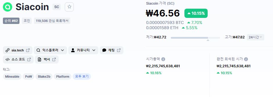시아코인의 시가총액 순위는 꽤 높은 편에 속하며 현재 62위 정도를 기록하고 있습니다.
