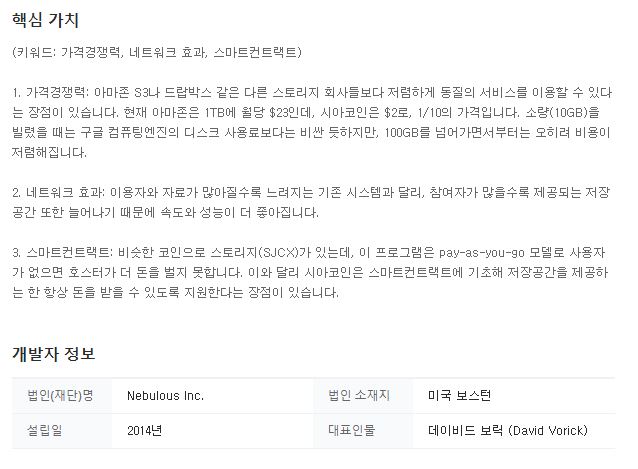 시아코인은 스토리지 부분(클라우드 서비스)을 블록체인화 시킨 코인입니다. 사람들이 사용하지 않는 저장공간을 공유하게 되면 이것을 합쳐 하나의 거대한 저장공간을 만들며 필요한 사람들에게 제공하게됩니다. 이런 서비스는 이미 기존에 있었으나 이러한 서비스는 어떤 기업인 제 3자에 의해 실행이되었었습니다. 이는 보안 또는 남용 문제가 있고, 시아코인은 블록체인, 스마트컨트랙트를 통해서 시스템을 분산화하고 암호화를시켜 이 문제들을 해결합니다.