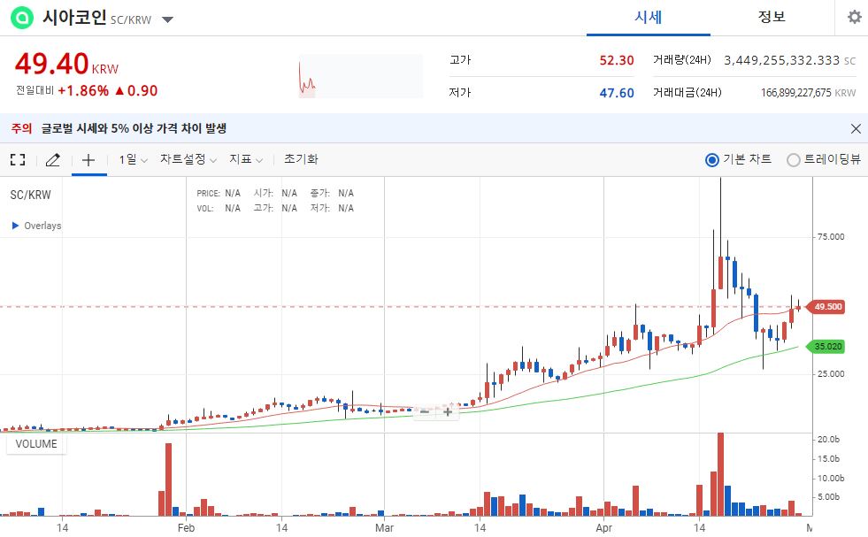시아코인은 21.04.28 현재기준 49.40원 정도에 거래가 되고 있습니다.