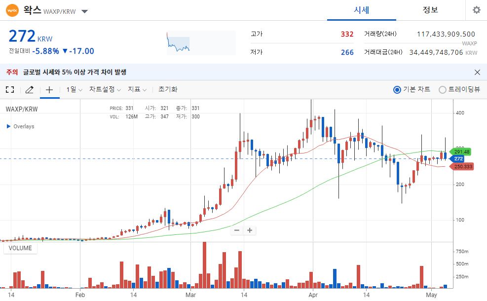 업비트에서 거래되고 있는 왁스 코인의 1일 차트입니다. 저번달 최고 400원 이상까지 올라갔으나 큰 하락세를 맞고 다시 반등하고 있는 모습입니다. 현재는 횡보를 하고 있다고 봐야겠네요. 21.05.04 현재 기준 약 272원에 거래가 이루어지고 있는 상황입니다.
