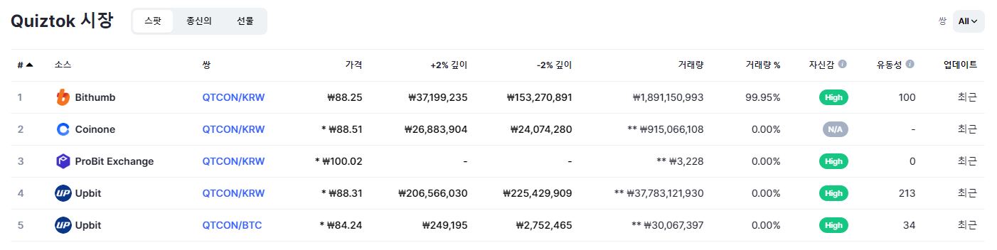 퀴즈톡이 상장된 거래소는 모두 국내 거래소로 업비트, 빗썸, 코인원, 프로비트에 상장이 되어있습니다.